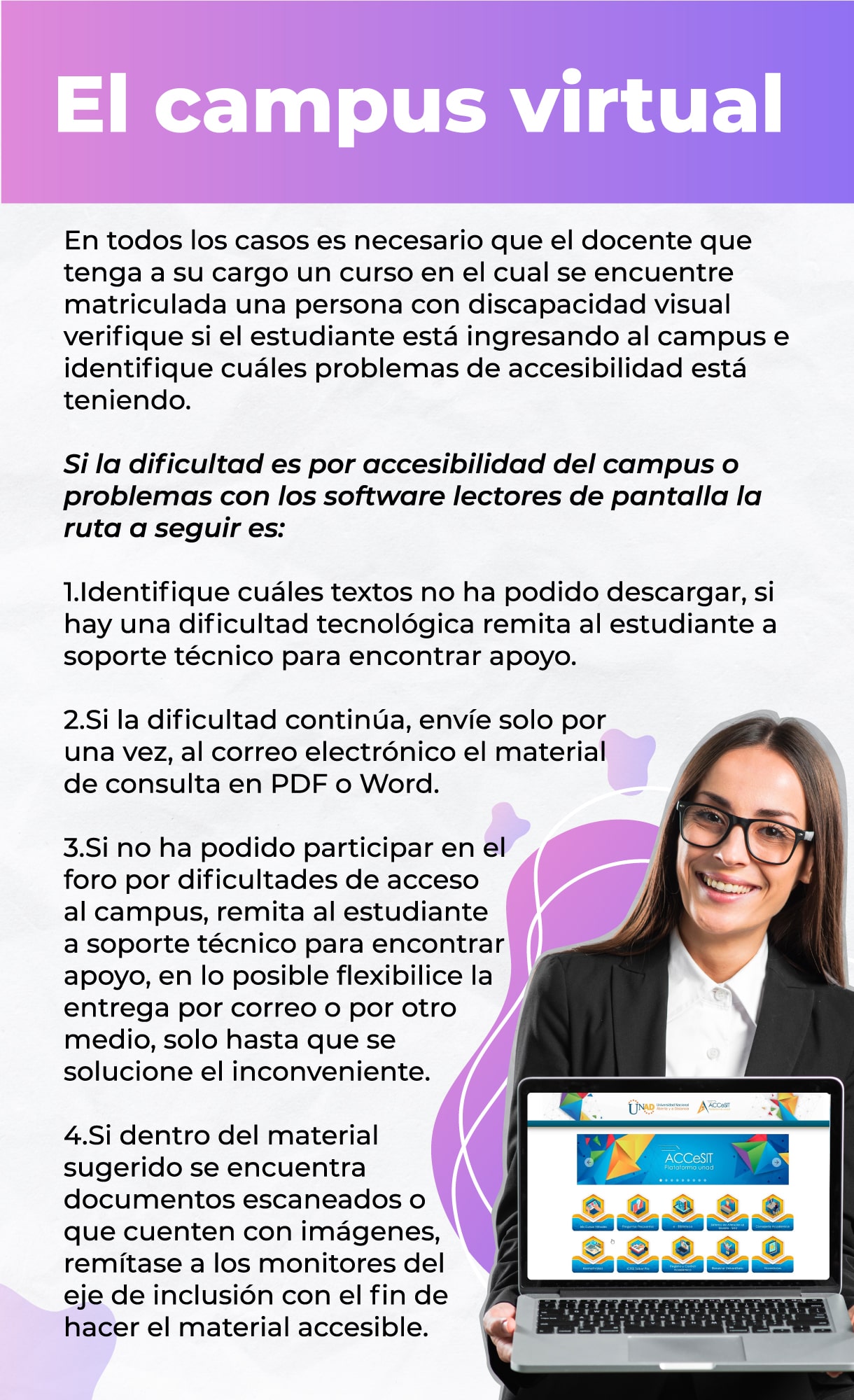 Cada persona con discapacidad es diversa, es un ser humano y sus características la hacen única, en los últimos años la discapacidad se ha conceptuado bajo el enfoque biopsicosocial y de calidad de vida, de tal manera que ha dejado de verse como una deficiencia de los individuos para ser considerada como parte de lo humano. en este sentido, este documento recoge algunas estrategias de trabajo con población con discapacidad, es una guía de trabajo para los funcionarios de la UNAD; es importante hacer una correcta interpretación de lo contenido en ésta guía e indispensable tener en cuenta el grado y tipo de discapacidad del estudiante o del aspirante, su trayectoria personal, su experiencia académica y procesos formativos anteriores.
